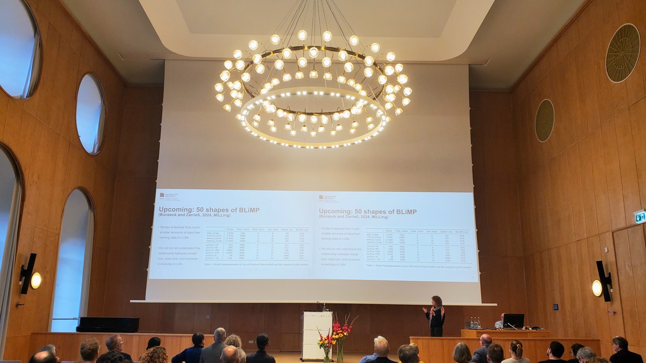 Bereits vor dem offiziellen Start des Plenarys bot das Pre-Conference-Tutorial „Large Language Models: Eine praktische Einführung“ von Jennifer Ecker, Pia Schwarz und Rebecca Wilm eine hervorragende Gelegenheit, sich mit den Grundlagen und praktischen Anwendungen von LLMs vertraut zu machen. Das Tutorial, das im Vortragssaal des Leibniz-Instituts für Deutsche Sprache stattfand, wurde von den Teilnehmenden als informativ und inspirierend gelobt. Für alle, die nicht dabei sein konnten, steht die Präsentation unter dem Link zur Verfügung.