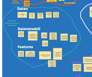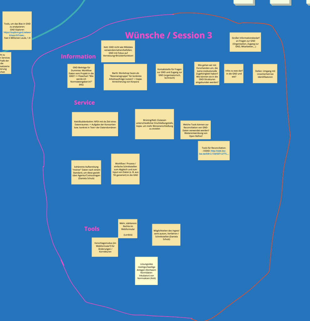 Der letzte Vortrag leitete thematisch über zur letzten Break Out Session, in der die zentrale Kernfrage behandelt wurde, was und wie Forschende zum Ausbau der GND beitragen können und welche Unterstützung sie dazu benötigen. Hier teilen sich die Antworten auf die drei Kategorien Informationen, Dienste und Werkzeuge. Im Einzelnen können die Impulse auf dem Conceptboard nachgelesen werden. An dieser Stelle ein Screenshot aus dem Kategorisierungsprozess (Abb. 12).