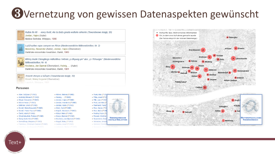 - Forschung zu sorbischen Sprachen (Obersorbisch, Niedersorbisch) als interessanter Aspekt in Text+ und der NFDI insgesamt, da es hier nicht lediglich um Mehrsprachigkeitsaspekte geht, sondern um Minderheitensprachen im Range einer Amtssprache. Text+ könnte diesem Aspekt innerhalb der NFDI Geltung verschaffen und hat unter der Überschrift Normdaten/GND konkrete Umsetzungs- oder Pilotideen an der Hand, die idealerweile ausstrahlen oder sich auf andere Szenarien übertragen lassen.