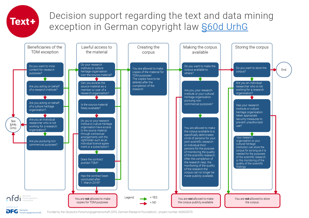 - i.e. an exception - in Section 60d UrhG since 2018, which describes the conditions under which researchers are permitted to carry out TDM. This TDM exception was amended in 2021 to transpose the European Union’s DSM Directive into German law. Text+ has published a publication on this (Assessment of the Impact of the DSM-Directive on Text+), accompanied by a handout that serves as a decision-making aid for the most important questions regarding the TDM barrier.